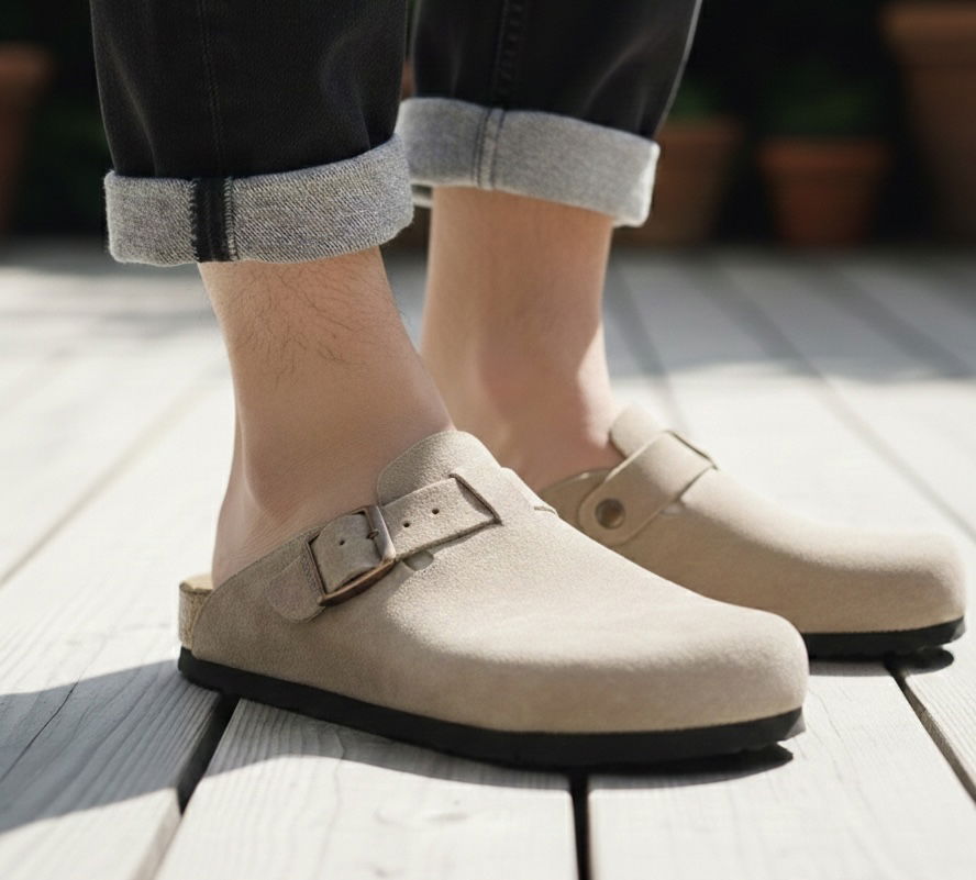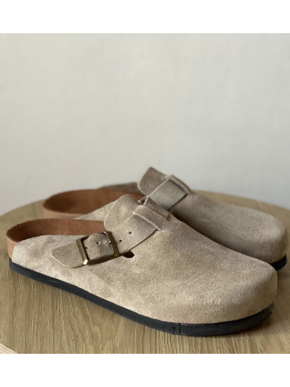 Zueco KALA de gamuza. Color arena versátil, suela cómoda y duradera, y hebilla de ajuste en tono oro viejo. Eleva tu look instantáneamente con este clásico atemporal.
