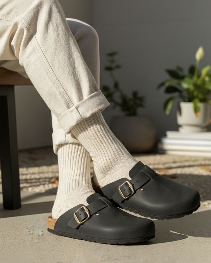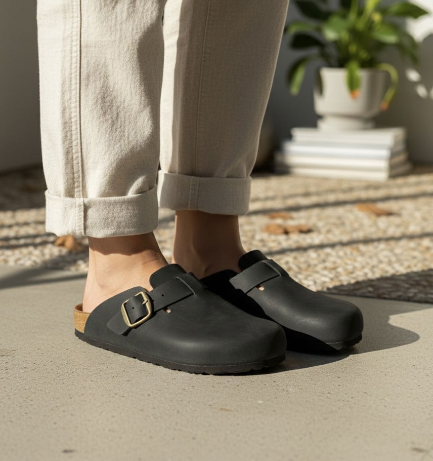 Sumate a la tendencia de la temporada con nuestros zuecos de diseño minimalista. Confeccionados en un cuero natural de acabado mate, estos zuecos son el equilibrio perfecto entre lo rústico y lo moderno. Su hebilla lateral en tono bronce no solo añade un detalle sofisticado, sino que permite un ajuste personalizado. Ideales para usar con medias en invierno o pies descalzos en media estación.