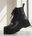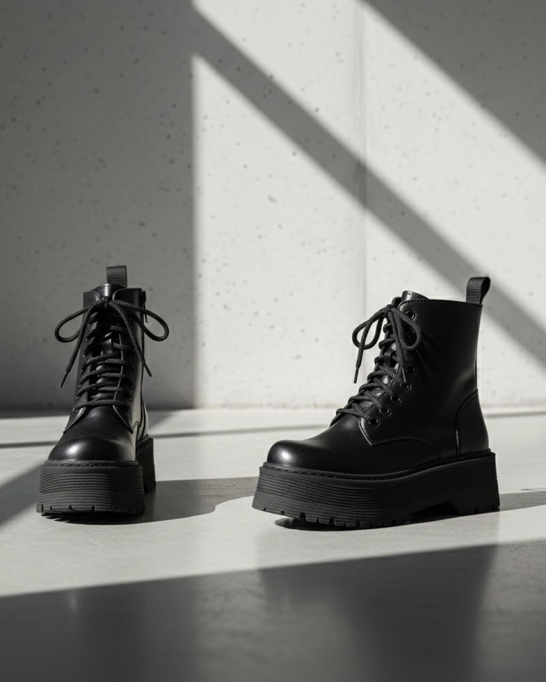 Este borcego de caña media destaca por su imponente plataforma track con textura lineal. Confeccionado en cuero sintético de alta calidad con acabado semi-mate, cordones encerados a tono y cierre lateral para un calce rápido. Es el aliado perfecto para elevar cualquier look casual o nocturno.