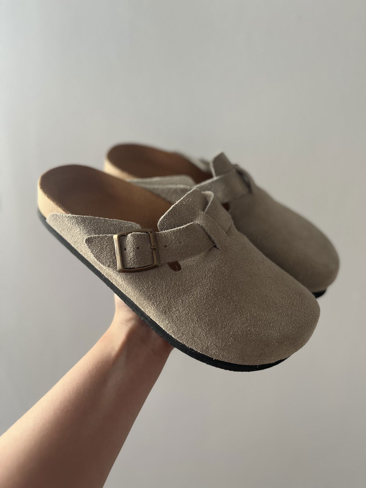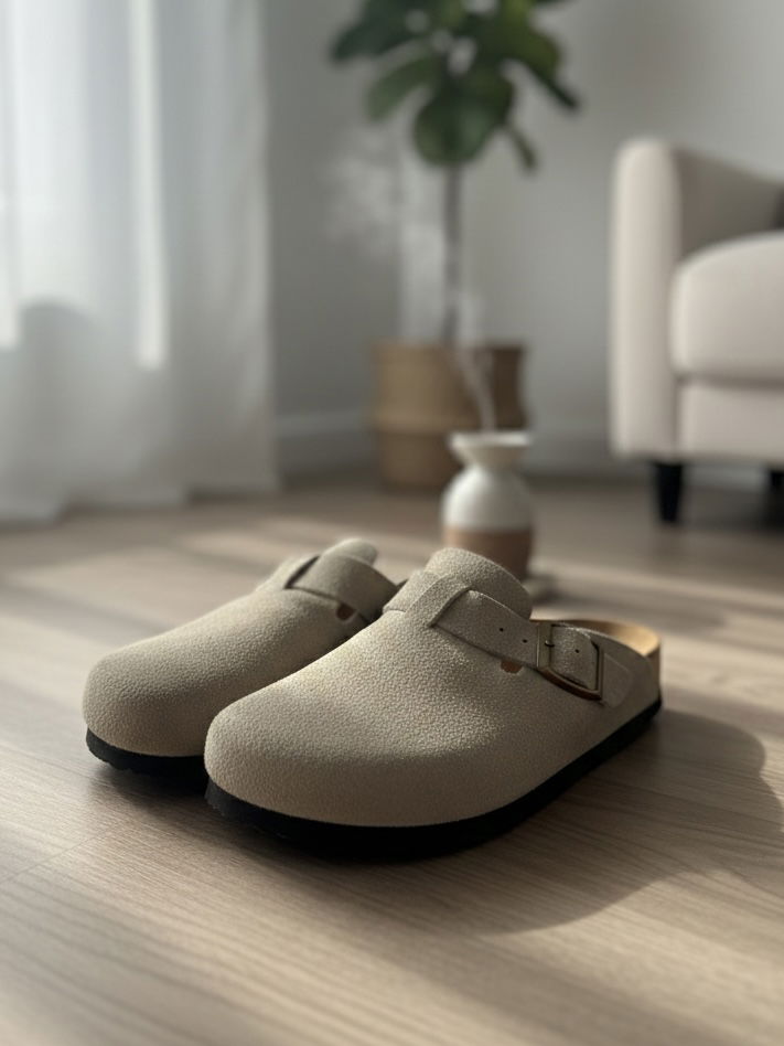 Zueco KALA de gamuza. Color arena versátil, suela cómoda y duradera, y hebilla de ajuste en tono oro viejo. Eleva tu look instantáneamente con este clásico atemporal.